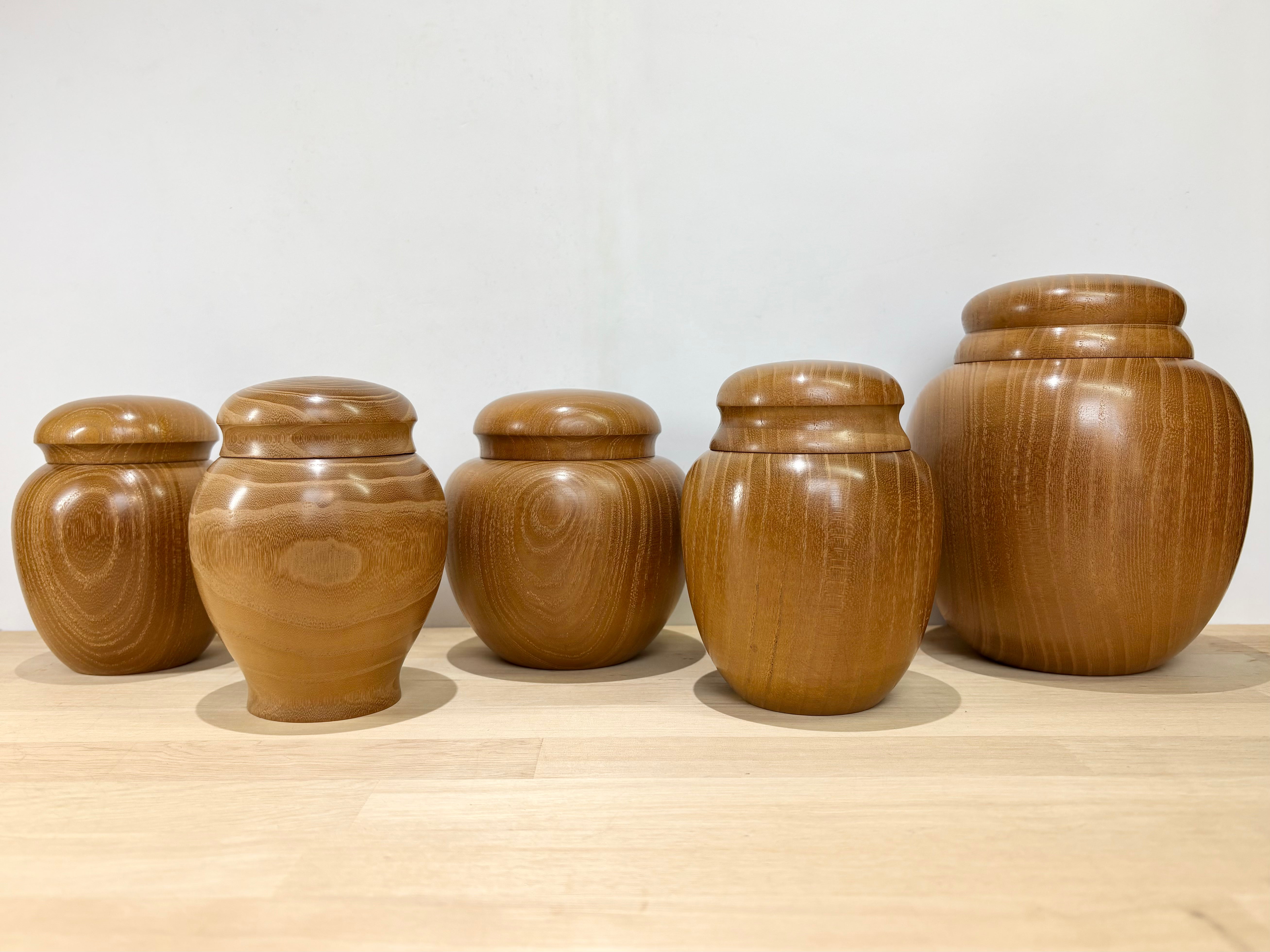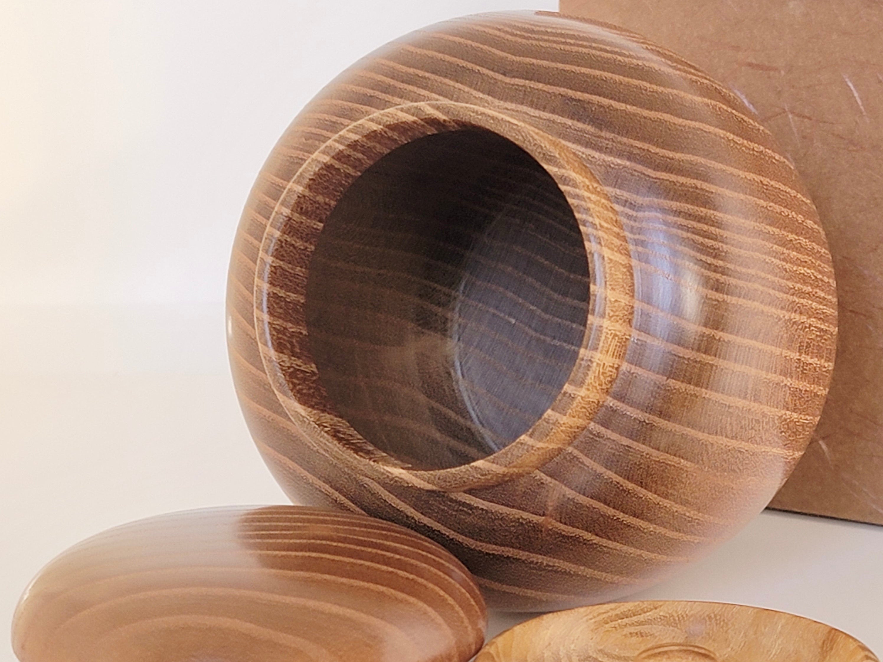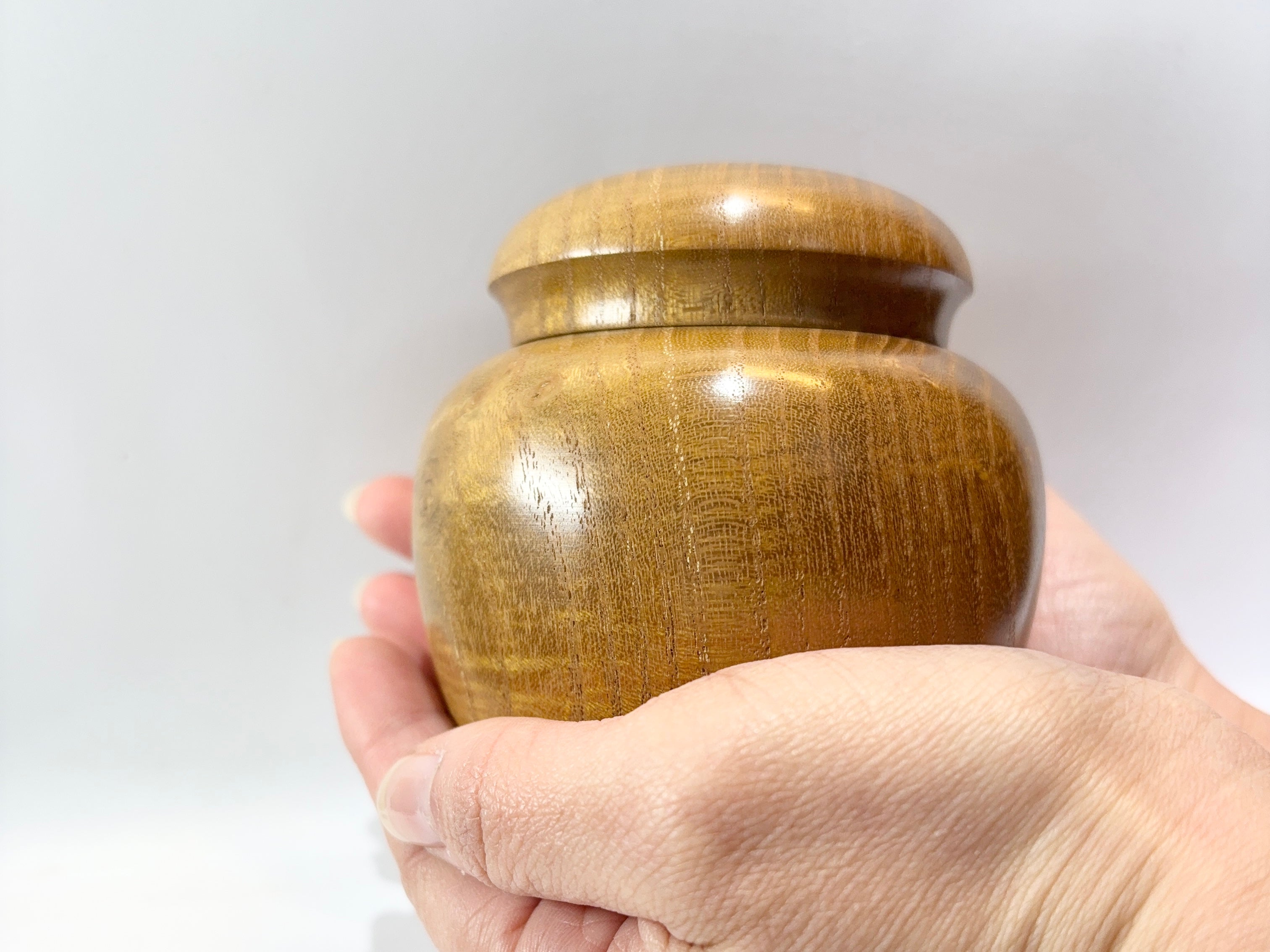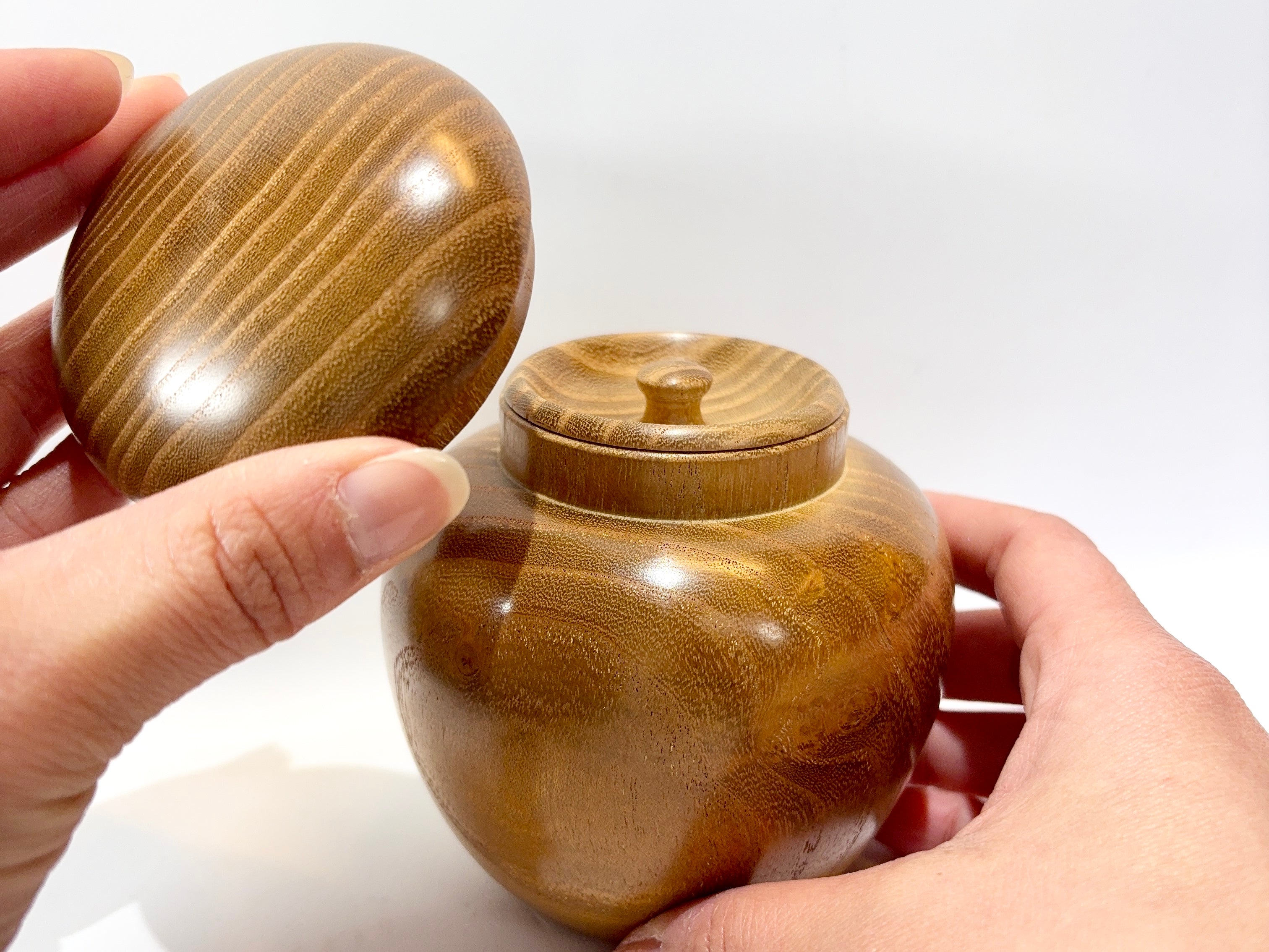 当店のろくろ製品は、選木から木取り、乾燥、仕上げ挽き、磨き、全ての工程を一人の木地師がとことん木と向き合い、真心こめて完成した一点物です。 塗装はせず、木地を磨いて艶を出して仕上げる技法にこだわりを持っています。木目の美しさや木の感触や温もりを存分に味わって頂けます。この木地仕上げゆえに季節や気候等、お使いになる環境次第でわずかに伸び縮みすることがあり、蓋具合に影響する場合もありますのでご了承下さい。撮影状況、またお客様の端末画面により色調が異なる場合がありますのでご了承ください。